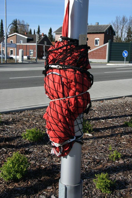 Die Fahne wird mit dem Netz zum Bündel eingepackt und mit den Gummiseilen gesichert.