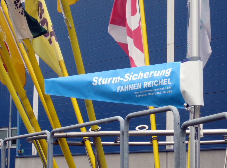 Um hier entgegen zu wirken, haben wir Sturmnetze und Sturmtaschen entwickelt, mit denen die Fahnen am Mast als Paket gesichert werden, ohne vom Mast entfernt werden zu müssen.