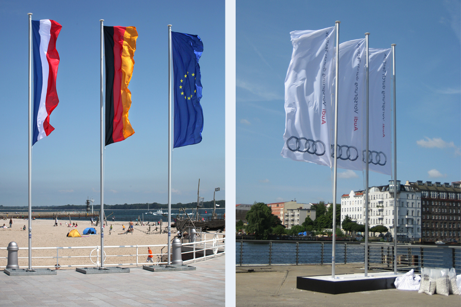 - Einzelne oder mehere Fahnenmasten, die in einer speziellen Bodenhülse mit einem Hilfsrahmen in das Erdreich eingelassen werden, ohne daß diese einbetoniert werden müssen, somit leicht zu demontieren sind.